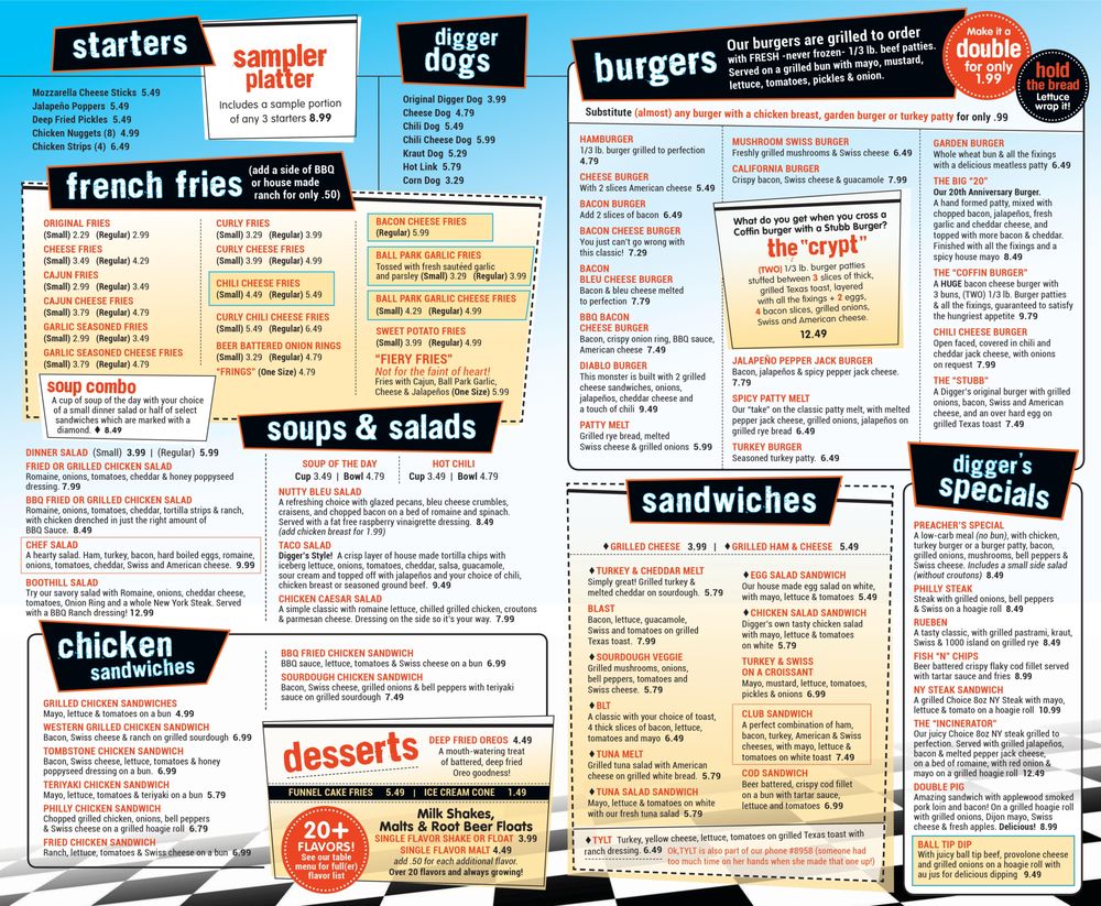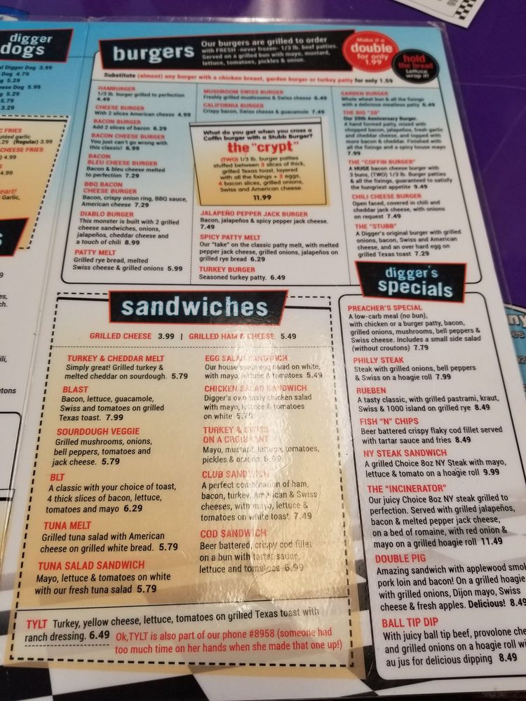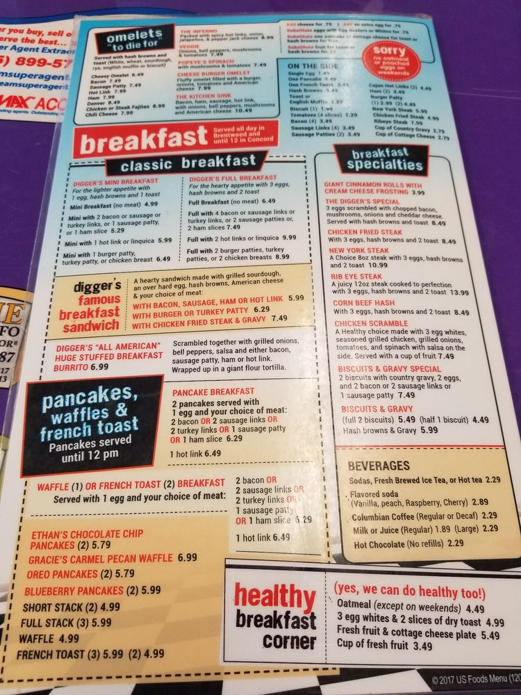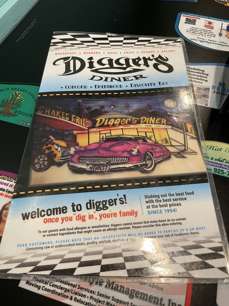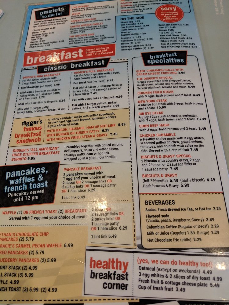 Introducing the menu at Digger’s Diner - Concord, a breakfast and brunch spot offering a variety of sandwiches and salads. With options for delivery, takeout, and reservations, this casual eatery also caters to vegan diners. Enjoy the diverse selection of French fries, from classic cheese fries to indulgent bacon cheese fries. Start your meal with appetizers like calamari or chicken strips. Don't miss out on the Digger Dog's menu featuring gourmet hot dogs topped with delicious toppings like chili and cheese. The relaxed atmosphere and ample seating make it a great spot for groups and families. The menu at Digger’s Diner - Concord offers something for everyone, whether you're in the mood for a hearty breakfast or a satisfying lunch.